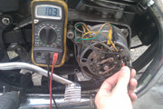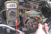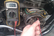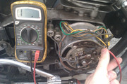 Wirnik wraz z szczotkami powinien stawiać ok. 10 omów oporu, jeśli tak nie jest to przyczyny mogą być dwie: -uszkodzone szczotki - wtedy wymiana -przerwanie cewki wirnika - też wymiana wirnika Gdy wirnik, szczotki i regulator są sprawne a ładowania nadal brak, pora przejść do sprawdzenia stojana. Odpinamy wszystkie kable ze stojana i sprawdzamy oporność między uzwojeniami, kolejne zdjęcie przedstawia tą czynność: