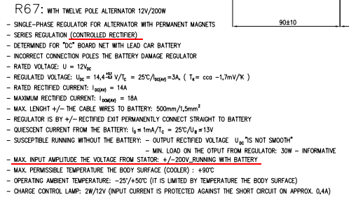 The voltage induced to coils on stator is always alternating. According to the need it has to be rectified using regulator R67 The principle of regulation : the load (of battery, lamp) is connected and disconnected to winding on stator in such a way to keep the middle value of direct-current voltage = 14V on battery. The over energy from alternator A67 is therefore not utilized that means there is lower coil heating-up on stator A67.
