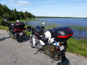 Po niecałych 3 godzinach snu wstajemy o 4-tej rano, z nieba leci niewielka mżawka. Składamy mokry namiot i bierzemy się za usuwanie awarii w CZ. Prostujemy kierunkowskaz przedni, tylny rozbieramy i poprawiamy połączenie styku masowego. W świetle pozycyjnym robimy nowy styk plusowy żarówki. O 6:40 wyjeżdżamy spod kempingu. Po dotarciu do portu szukamy miejsca odprawy. Ledwo zdążyliśmy. Stoimy w gęstym deszczu czekając na naszą kolej wjazdu na prom (zazwyczaj motocykle wjeżdżają jako ostatnie, a wyjeżdżają jako pierwsze). Na promie stawiamy motocykle na stopki centralne i przypinamy je po 4 pasy na motocykl. Po zjeździe z promu zatrzymujemy się jeszcze na chwilę by poprawić kierunkowskaz w CZ, przy okazji regulujemy sprzęgło oraz gaźnik. Po regulacjach CZ odpala trochę lepiej. Ruszamy w kierunku Lahti. W CZ na wolnych obrotach słychać prychanie spod którejś z głowicy. Z powodu wczesnej pory jedziemy kawałek dalej, nocujemy na dziko w okolicy miasta Sysmä. O 18-tej mamy już rozbity namiot, idziemy spać około dwudziestej.