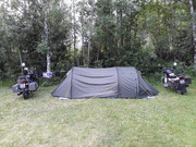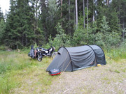 Dojechaliśmy na miejsce około godziny 22:30, zaczęło padać. Rozkładamy szybko namiot po ciemku i szykujemy się do snu. Jutro rano planujemy uporać się z problemami.