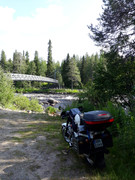 Za pomocą kilku pilników oraz klucza nastawnego szlifujemy nakrętkę M5 od zewnątrz i wewnątrz i wprasowujemy wykonaną tulejkę do klamki sprzęgła. Po tym zabiegu bez problemu regulujemy sprzęgło. Ruszamy dalej około 11-tej. W CZ od paru dni słychać przedmuchy spod głowicy. Nie mamy odpowiedniego klucza, by można było podejść do nakrętek głowicy, więc szukamy takiego w pobliskich sklepach budowlano – narzędziowych. W końcu udaje nam się kupić odpowiedni klucz w sklepie Clas Ohlson w galerii handlowej w Narwiku za 90 NOK (około 40zł). Zatrzymaliśmy się na stacji Shell, na obrzeżach miasta by naprawić awarię w CZ. Po ściągnięciu baku i obu głowic okazało się, że winna była delikatnie krzywo ułożona uszczelka na prawym cylindrze. Po ułożeniu uszczelki na nowo i skręceniu przedmuchy ustały. CZ zaczęła łatwiej odpalać. Naprawa zajęła sporo czasu, ruszyliśmy dalej dopiero przed 19 w kierunku przeprawy promowej Skarberget – Bognes (niestety innej drogi nie ma). Około 20:30 wsiedliśmy na prom. Pokonał 6km w 25min i za dwa motocykle zapłaciliśmy 144 NOK (około 32zł za motocykl). Przy szukaniu miejsca do spania na dziko Jawa zaliczyła wywrotkę na lewą stronę przy próbie zawracania na leśnej pochyłej drodze. Skrzywił się kierunkowskaz przedni, kierownica obróciła się na mocowaniu, oraz przekrzywiło się lusterko wraz z osłoną rąk. Po szybkim prostowaniu jechaliśmy dalej.